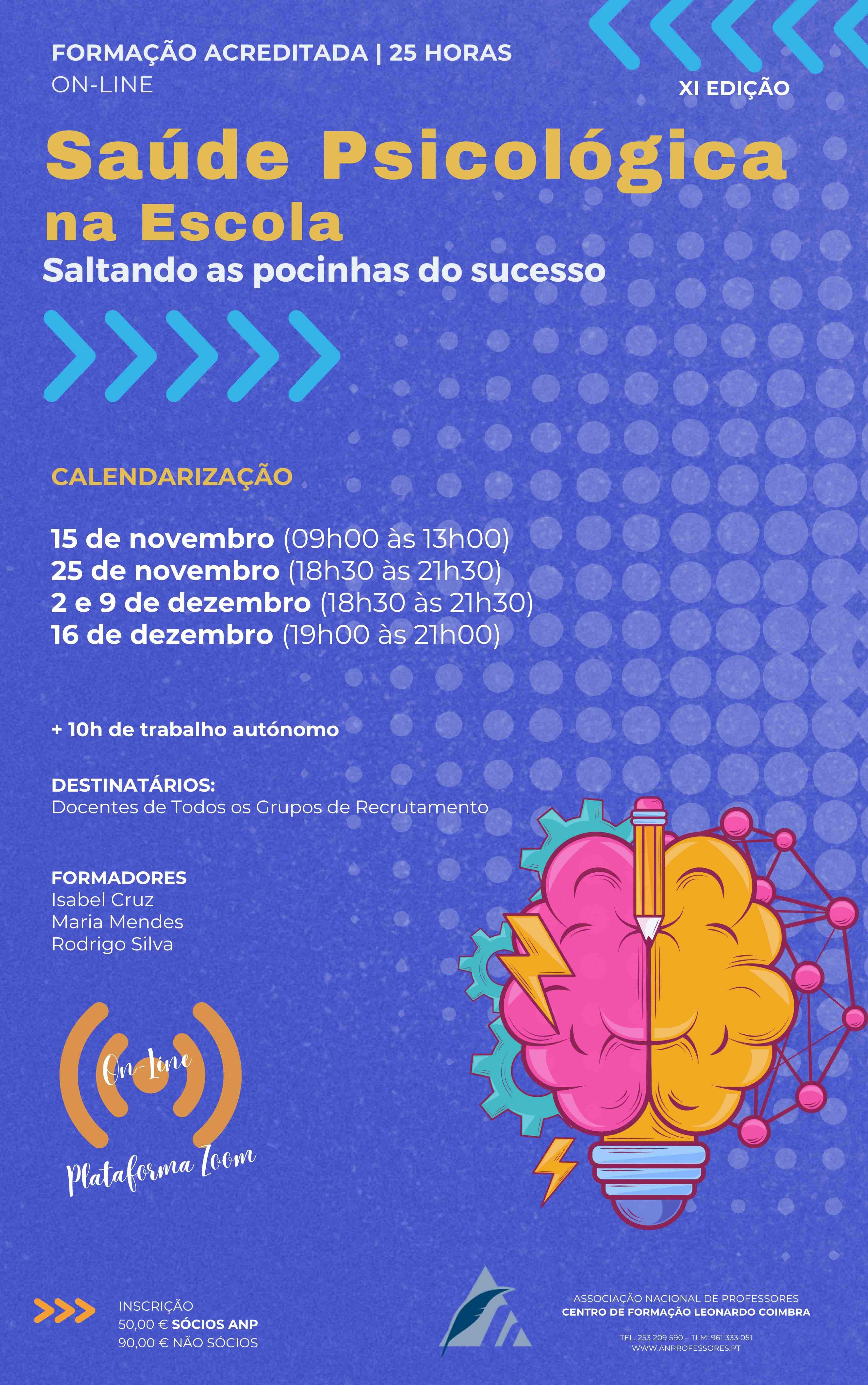 O Centro de Formação Leonardo Coimbra da Associação Nacional de Professores irá realizar a ação de formação “Saúde Psicológica na Escola - saltando as pocinhas do sucesso”.