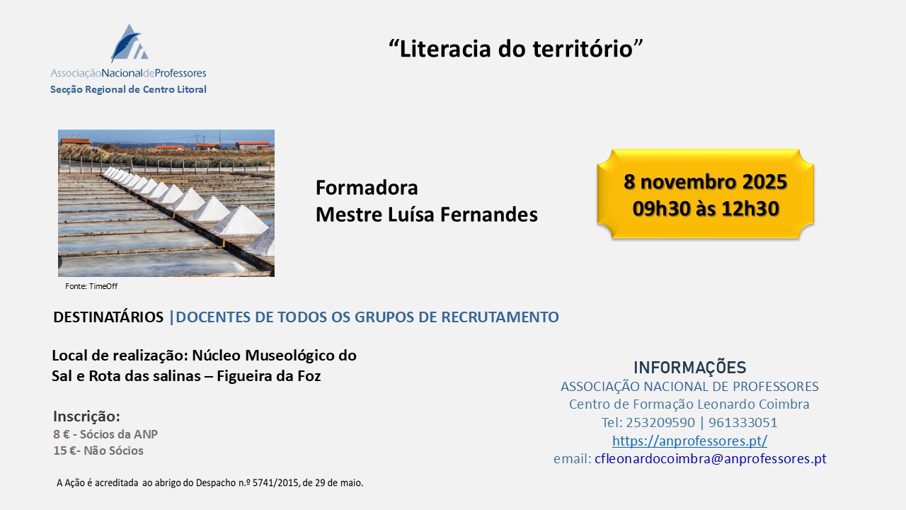 A Secção Regional de Centro Litoral da ANP tem o prazer de convidar todos os colegas associados e amigos, a participarem na ação de formação “Literacia do Território” a realizar no dia 8 de novembro, das 09h30m às 12h30m, orientada pela Formadora Luísa Fernandes.
